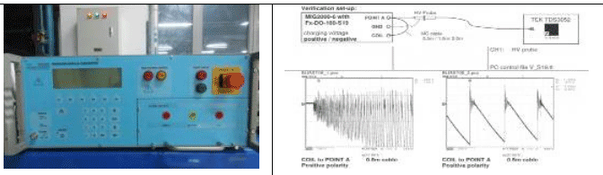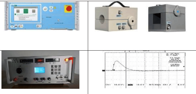 电压尖峰(第 17 章):实验室配备瑞士 EMC PARTNER 试验仪器,输出波形峰值达到 600V,波形参数完全吻合标准要求;不同于传统通过线缆注入尖峰信号的方式,通过探头将尖峰信号耦合注入到电源线中,由于缺少了线缆捏合带来的阻抗不一致性,尖峰信号波形更加稳定。