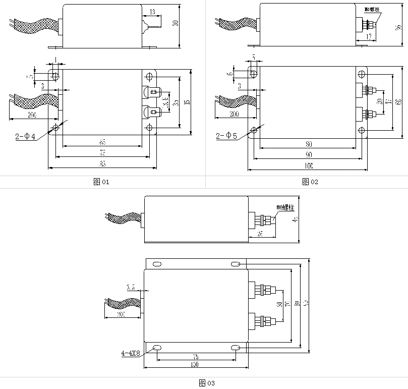 当滤波器的端接方式为接线螺柱时,接线螺柱上配有紧固附件(螺母、垫片等),安装旋紧螺母时,旋紧扭力矩M4接线柱不得超过1N·m、M6接线柱不得超过2N·m。