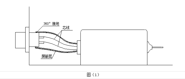 CAP系列滤波器达到预期效能的关键在于滤波器的输入电缆的接法,要求屏蔽层沿电缆芯线360度接地,如图(1)所示。