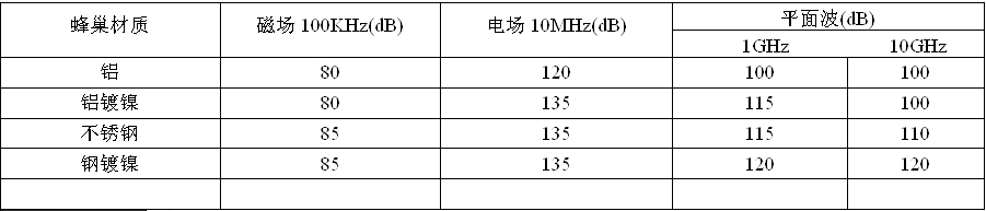 屏蔽效能(dB)以下测试标准为MIL-G-83528,通风板蜂巢直径3.2mm,深度12.7mm为例。